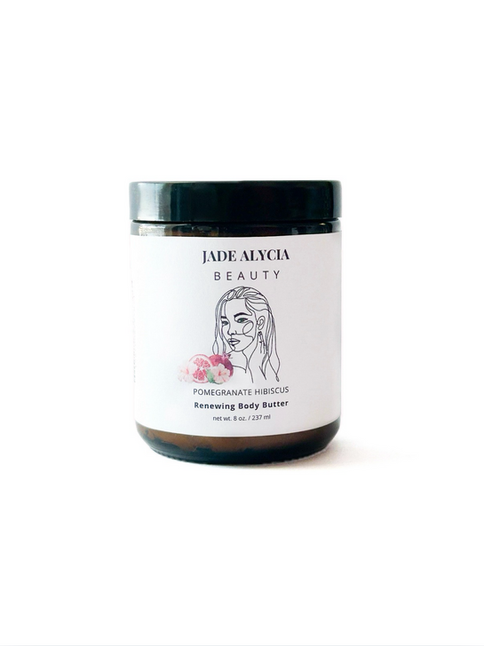 Jade Alycia Beauty’s Pomegranate Hibiscus Renewing Body Butter is the original formula you know and trust, now with a mouthwatering fruity fragrance. Indulge in the soothing luxury of intense hydration, unparalleled protection, and transformational healing for your skin with its rich, creamy texture. As a part of our premium bodycare collection, this non-greasy highly absorbent body butter is hand-whipped for a silky soft application that promotes a radiant complexion, long-lasting moisture and accelerated repair. Additionally, this blend supports the reduction of fine lines, wrinkles, and uneven skin tone. Its lightly scented pomegranate aroma will leave you glowing and ready for more.